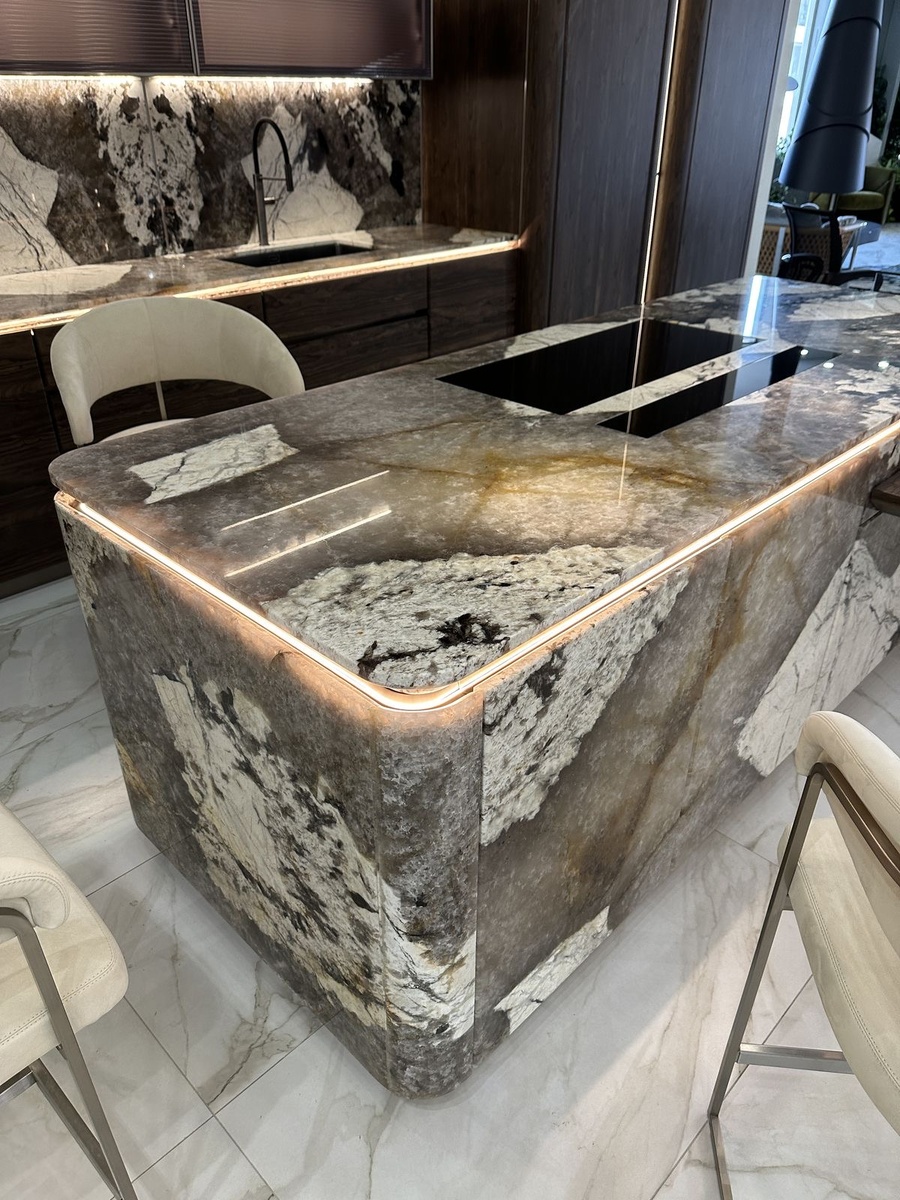 Кварцевый агломерат — прочный и эстетичный материал для столешниц, но его монтаж в нестандартных конфигурациях требует особого подхода. Разбираем ключевые моменты: как работать с криволинейными формами, интегрировать технику и избегать типичных ошибок. 1. Криволинейные формы: что важно знать При создании изогнутых столешниц учитывайте: Минимальный радиус изгиба. Для большинства плит — не менее 50 мм. Точные значения уточняйте у производителя: они зависят от толщины и состава материала. Технология обработки. Криволинейные кромки фрезеруются на ЧПУ-станках. Ручная обработка недопустима: высок риск сколов. Усиление конструкции. Изогнутые участки требуют жёсткого каркаса с дополнительными опорами каждые 400–600 мм. Схема монтажа криволинейной столешницы: Подготовка каркаса с учётом радиуса изгиба. Примерка заготовки с проверкой зазоров. Фиксация на жидкие гвозди + механические крепления. Герметизация стыков силиконовым составом. 2. Интеграция мойки и варочной панели Мойка: Вырез вып