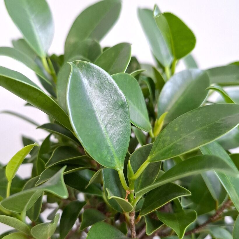 19. Фикус ретуза американская. В природной среде вырастает более 2х метров в высоту. Дома имеет небольшой размер. Листья до 9 сантиметров в длину, овальной формы с вытянутыми тупыми кончиками. При благоприятных условиях формируют плотную крону и полностью покрывают ствол и ветви. Молодые листочки имеют светло-зелёные пятна в центральной части. Со временем цвет листьев становится тёмно-зелёным. Ретуза американская считается довольно неприхотливым быстрорастущим растением. 20. Фикус микрокарпа альбамаргината. Этот вид вырастает до 25 метров. В домашних условиях не превышает 1,5 метра. Растёт довольно медленно. Цвет листа белый с зелёным рисунком, который у каждого листочка индивидуален. Теплолюбивое растение, хорошо себя чувствует при температуре 25-28. Очень не любят перепадов температур. Достаточна требовательная к освещению, этому растению требуется намного больше света, чем фикусам с зелёными листочками. Любит повышенную влажность 60-70%. Обязательно это нужно учитывать, осо
