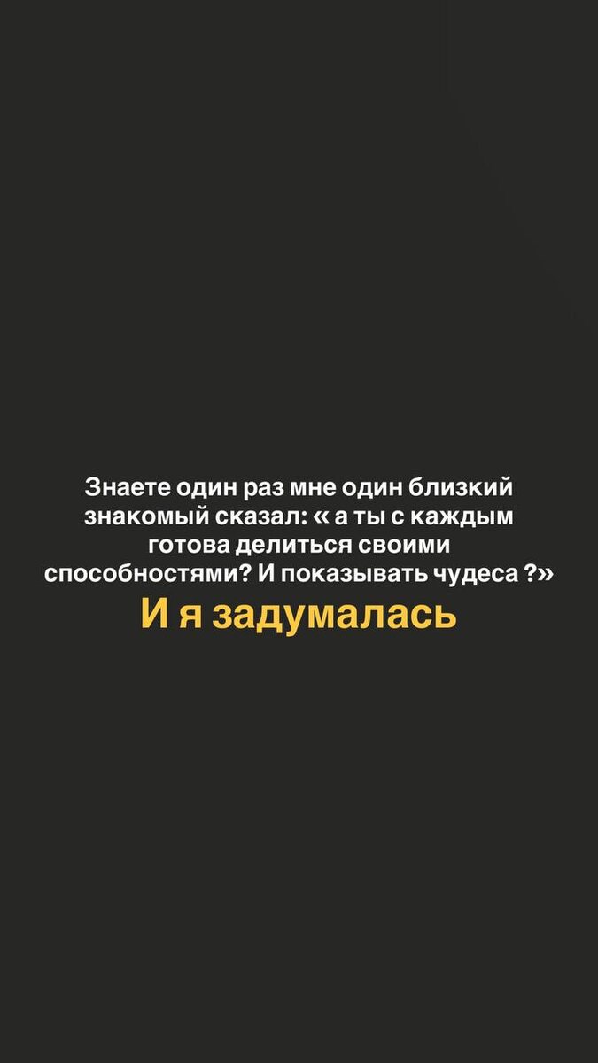В сторис сегодня поделилась тем, что больше не хочу никак соприкасаться, проводить церемонии тем, кто не верит в чудеса и энергии. Некоторые люди приходят и говорят : «докажи» это очень опустошает. Я же не клоун в цирке. И сверх- способности это не развлечения. Это забирает очень много энергии. Делюсь частично здесь. Кому интересно- можете посмотреть 👉смотреть сторис 👈