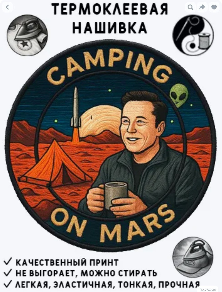 А тем временем люди, вдохновлённые обещаниями Илона Остаповича, могут себе заказать (на маркетплейсах) вот такие изображения марсианского кемпинга. Собственно, это их единственный способ почувствовать себя на Марсе.