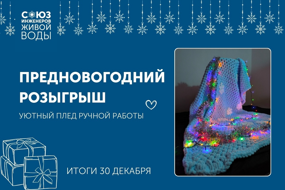 Предновогодний розыгрыш от Союза Инженеров Живой Воды! По традиции открываем наш сезон зимней сказки розыгрышем, итоги подведем 30 декабря, а приз отправим в течение новогодних праздников. В этот раз на кону абсолютный уют, идеальный новогодний подарок и практически воплощение теплых объятий 🥰 Наш руководитель PR-направления Алекс Лебедева лично разработала дизайн и своими руками (и исключительно под фоновый просмотр новогодних фильмов!) связала мягчайший плюшевый плед с декором из снежинок в цветах Союза Инженеров Живой Воды. Размер 125х180 сантиметров. Плед отправится участнику розыгрыша, которого мы выберем случайным образом 30 декабря. Рассказываем, как стать участником: ❄ Вступить в сообщество Союза Инженеров Живой Воды; ❄ Поставить лайк этому посту; ❄ Сделать репост на свою страницу (не удаляйте до конца розыгрыша, мы проверим!); ❄ Включить уведомления от сообщества о новых публикациях (нужно нажать на три точки или "еще", а потом на колокольчик, чтобы у колокольчика появи
