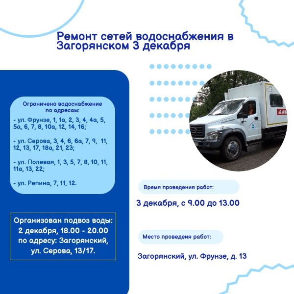 🛠🚧 Ремонт сетей водоснабжения в Загорянском 3 декабря В связи с проведением аварийно-восстановительных работ на сетях холодного водоснабжения (Загорянский, ул. Фрунзе, д. 13), 2 декабря, в 16.00 отключена холодная вода по адресам ИЖС: ➡️ ул. Фрунзе, 1, 1а, 2, 3, 4, 4а, 5, 5а, 6, 7, 8, 10а, 12, 14, 16; ➡️ ул. Серова, 3, 4, 6, 6а, 7, 9, 11, 12, 13, 17, 18а, 21, 23; ➡️ ул. Полевая, 1, 3, 5, 7, 8, 10, 11, 11а, 13, 22; ➡️ ул. Репина, 7, 11, 12. 🚛 Организован подвоз воды: 2 декабря, 18.00 - 20.00 по адресу: Загорянский, ул. Серова, 13/17. 🛠 Аварийно-восстановительные работы будут проведены 3 декабря, с 9.00 до 13.00 . Приносим извинения за доставленные неудобства! Телефон аварийно-диспетчерской службы: 8 496 562-11-72.