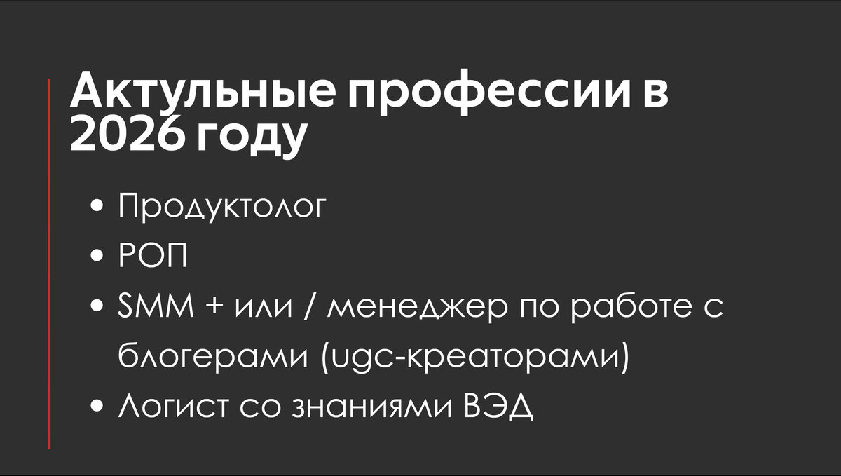 В 2026 году в сфере маркетплейсов будут особенно востребованы специалисты, которые умеют управлять выручкой, продуктом, трафиком и логистикой в связке, а не по отдельности. Важно закрывать весь путь товара — от идеи и ввоза до продвижения и продаж.
