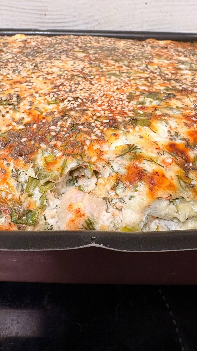 🍳 Омлет в духовке, или "почти хачапури" =) Очень сытная штука. На 10 порций, поэтому подойдёт на всю неделю (или на семью). Готовится суперпросто: всё смешал, в духовку на 50 минут — и готово. 📊 КБЖУ (на 1 порцию): 245 ккал, 42.1 г белка, 7.3 г жира, 5.1 г углеводов 🛒 Ингредиенты: • Яичный белок — 1500 г • Творог обезжиренный — 540 г • Нежирный сыр — 180 г • Куриный рулет — 350 г • Зелёнь (лук, кинза, укроп) — 200 г • Молоко 1.5% — 300 г • Соль и специи по вкусу • Сверху я присыпал кунжутом и семенами чиа — для текстуры 👨🍳 Как готовить: Смешать всё в большой миске Вылить в форму Выпекать 50 минут при 180°C Остудить 10–15 минут перед нарезкой 💡 В этом варианте творог, сыр и зелень дают вкус, который очень напоминает хачапури с зеленью. Прям вот честно удивился. Можно экспериментировать с ингридиентами как душе угодно.