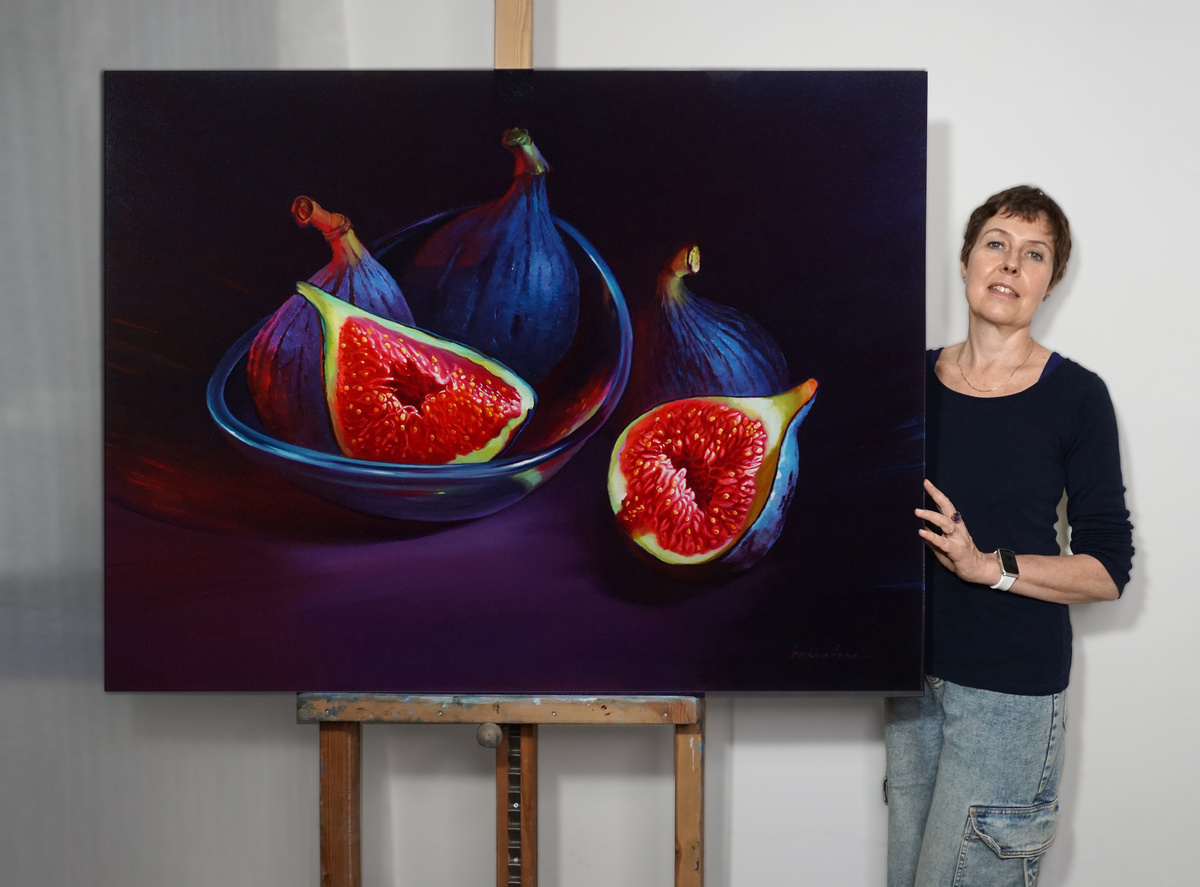 Картина Инжир. Художник Анна Гречина. Живопись, масло, холст. 60х120см. Гиперреализм. Эта картина была сделана ещё весной. 🫐... Из смешного: весной купить инжир, а особенно красивый, сложно даже в Москве)). И я как в сказке 12 месяцев бегала за "подснежниками"))). Спасибо Дорогомиловскому рынку и восточным специалистам по фруктам - выручили! ✌️