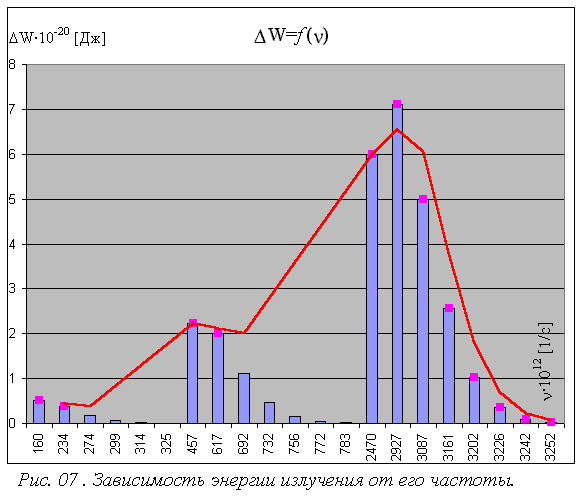 В результате видим знакомый из практики набор спектральных линий. Формула же Планка может быть оценена, как изящная математическая аппроксимация не существующей зависимости (жирная красная линия на рис.07), связанная с неправильной интерпретацией экспериментов, которая в принципе может служить для описания процесса в первом приближении.
