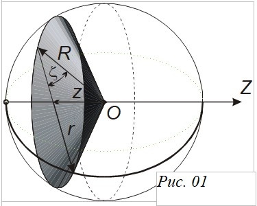 где R — радиус некого шара с центром в точке О. Точка O принадлежит основной плоскости (XY). Таким образом электрон всегда будет находится на расстоянии R = const от центра масс атома, эта константа известна, как боровский радиус.