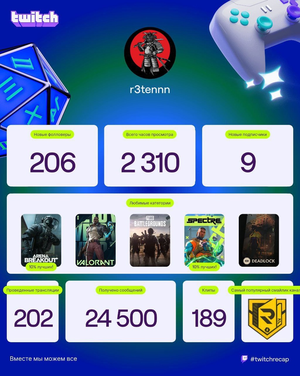 Итоги 2025 года на твиче как стримера и как зрителя. Плотный салам летит Айболиту, спасибо тебе, из-за твоих стримов скилл на ТВшке поднялся ✌️ Спасибо всем кто смотрел меня в этом году, дальше больше, дальше лучше ❤️ P.S Посмотреть свои итоги можно здесь. Делитесь своими итогами в комментариях 🔻