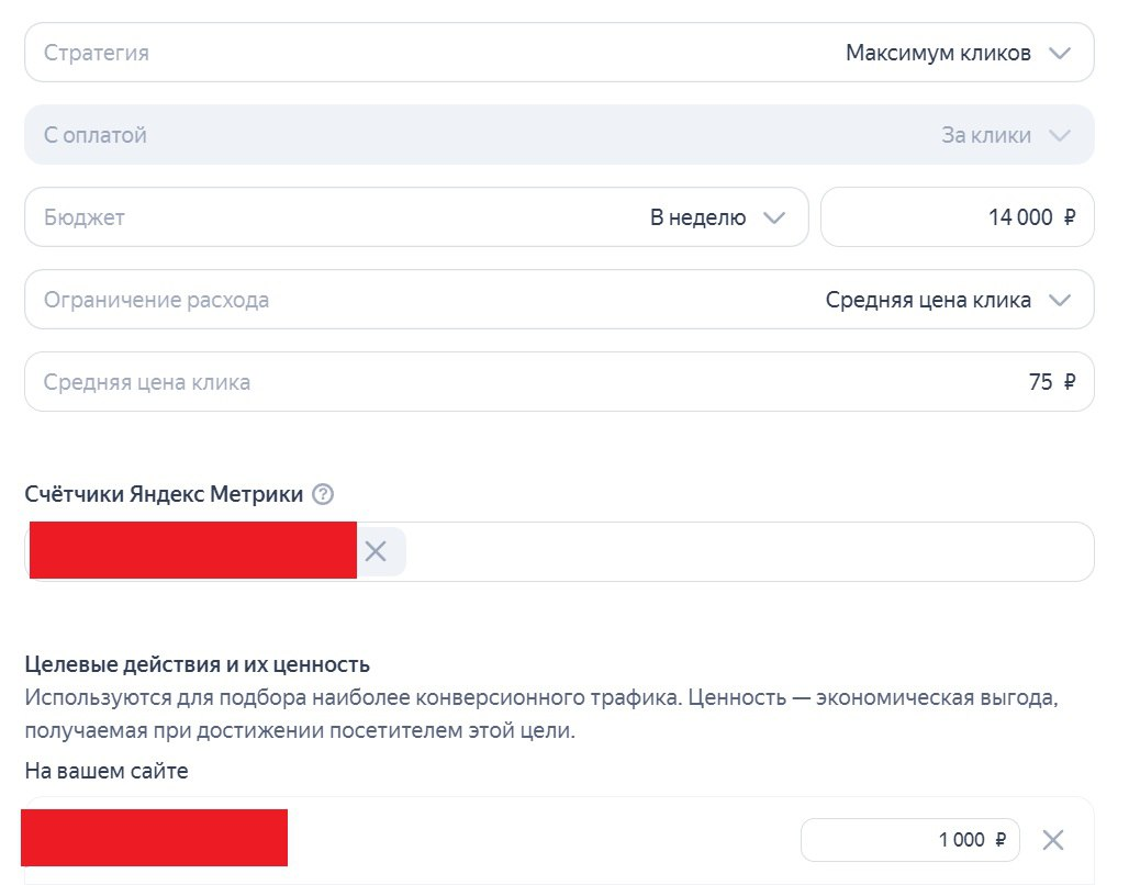 В нашей работе мы часто сталкиваемся с такими "рекомендациями" Яндекса и нашли способ, как в большинстве случаев избавиться от них. Для этого необходимо в параметрах кампании поменять стратегию на Максимум кликов с настройками, как на скриншоте 2. Достаточно будет покрутить эту кампанию от 7 дней на такой стратегии, после чего можно снова переводить на стратегию с оплатой за конверсии.