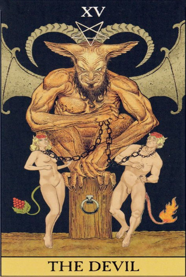 - Зависимости и компульсии: Алкогольная, наркотическая и игровая зависимость, токсичные отношения, шопоголизм, трудоголизм, бесконечный скроллинг по соц сетям. Всё это попытки бегства от реальности, заполнения внутренней пустоты внешними стимуляторами. Дьявол держит факел опущенным которым поджигает хвосты мужской и женской фигуре — свет сознания направлен вниз, на материальное и сиюминутное, а не вверх, на духовное развитие. То что называется занижением частоты вибрации.