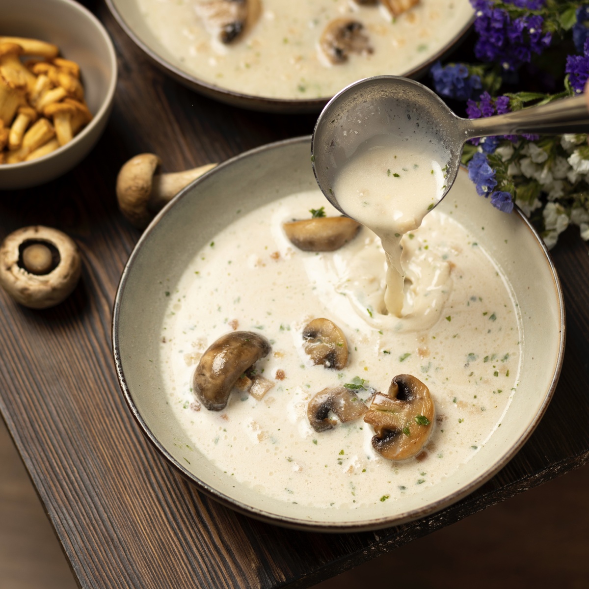 Сегодня делимся рецептом традиционного французского блюда: грибного крем-супа. Вариаций рецептов его существует множество. Блюдо стало популярным в XX веке, когда американская компания Campbell Soup Company выпустила его в консервированном виде. Суп – сытный и нежный, и готовится достаточно легко. Ингредиенты Шампиньоны 300 г Репчатый лук 1 головка Чеснок 1 зубчик Сливочное масло 30 г Оливковое масло 30 мл Пшеничная мука 1 ст. л Белое сухое вино 60 мл Куриный бульон 700 мл Сливки 250 мл Мускатный орех по вкусу Соль по вкусу Молотый черный перец по вкусу Петрушка по вкусу Сухарики для украшения Лук очистите и порежьте на маленькие кусочки. В сковороду добавить сливочное и оливковое масло и обжарить лук до прозрачности. К луку добавить измельченный чеснок и жарить еще около минуты. Грибы нарежьте на тонкие ломтики и обжаривайте вместе с луком и чесноком. Тщательно помешивайте, пока грибы не выделят влагу. Засыпьте 1 столовую ложку муки и перемешайте. Влейте к грибам вино и выпаривайте н