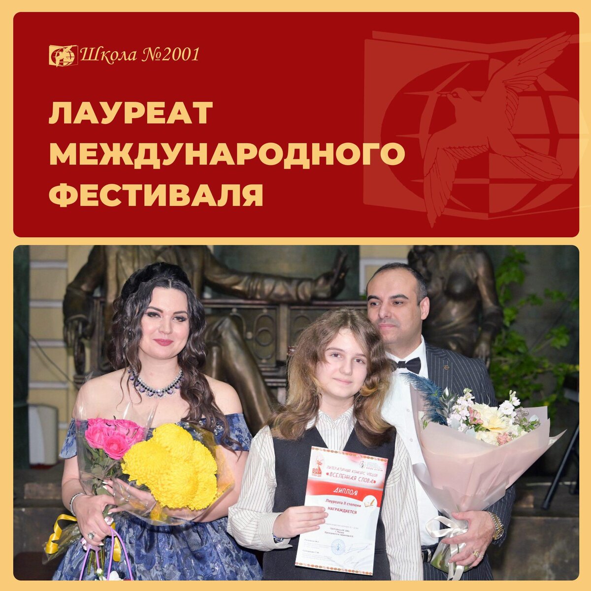 🎉 Поздравляем Ксению с заслуженной наградой! Гала-концертом и вручением призов в галерее Зураба Церетели завершился IX Московский международный фестиваль искусств «Звуки дутара». В этом году фестиваль собрал большое жюри — актёров театра и кино, преподавателей вузов, заслуженных деятелей культуры и сценаристов. Литературное направление «Вселенная слова» было посвящено 80-летию Победы в Великой Отечественной войне и Международному году мира и доверия. 🌟 Ученица Школы № 2001 и участница студии «Мастерская души» Ксения получила диплом лауреата II степени за проникновенное исполнение произведения Юлии Друниной «Ёлка». Желаем Ксении и её педагогу Вере Евгеньевне Шуваловой вдохновения, творческих успехов и новых ярких побед! #ДОНМ #Школа2001 #ТалантливыеДетиМосквы 🎓 WEB 👻 MAX 📲 ВК
