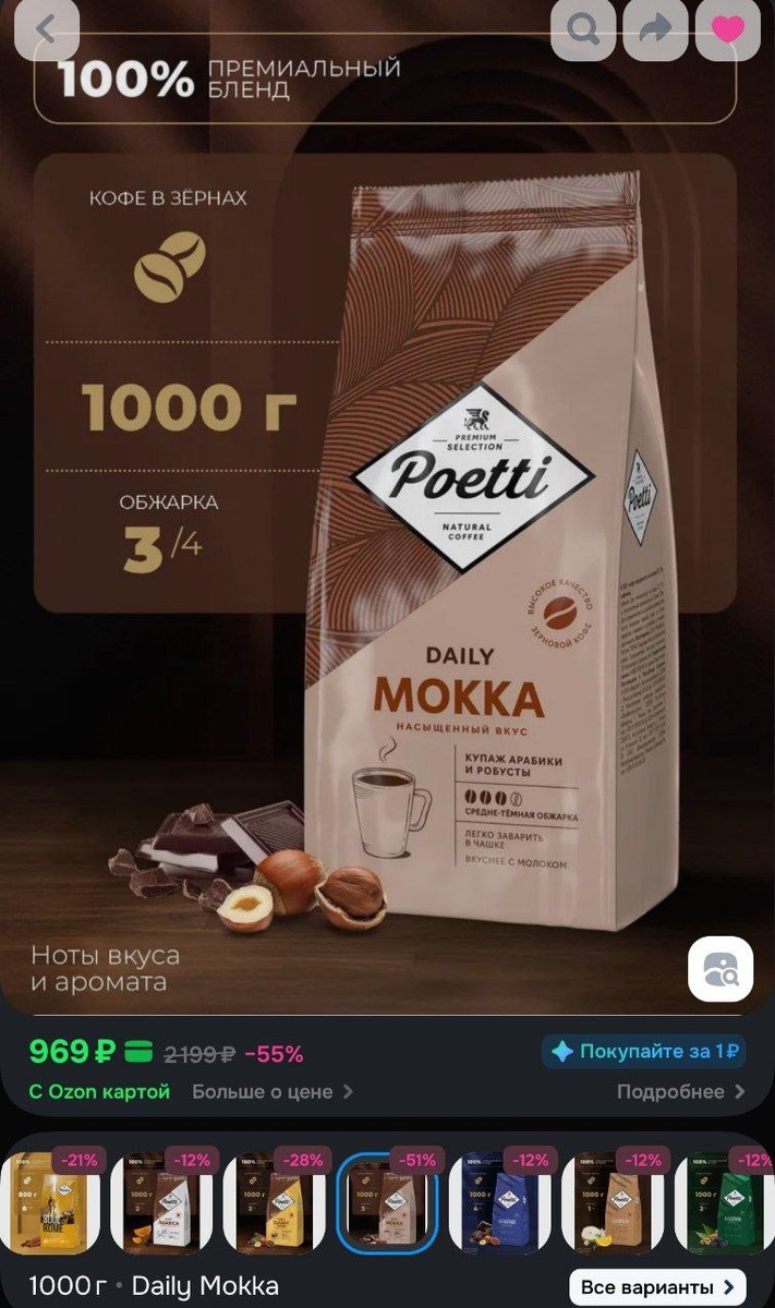 🔥 Кофе в зёрнах Poetti Daily Mokka, арабика, робуста, 1 кг за 969₽ https://ozon.ru/t/9w87KY8