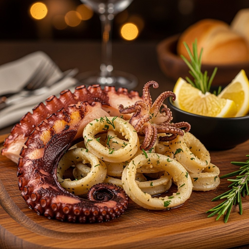 На прилавках они лежат рядом, оба относятся к головоногим моллюскам, и в рецептах их иногда подменяют. Но осьминог и кальмар — совершенно разные продукты. Ошибка в выборе может испортить блюдо: одно станет «резиновым», другое — разварится. Давайте разберемся раз и навсегда, как их отличить визуально, какое мясо у каждого и как их готовить, чтобы они получились идеальными. Главные отличия: внешность и текстура Представьте, что вы детектив на рыбном рынке. Вот ваша памятка: Тело: Кальмар — торпедообразное, удлиненное, с жесткой хитиновой пластинкой внутри. Напоминает цилиндр с плавниками. Осьминог — мешкообразное, округлое, мягкое. Больше похож на большую каплю или шар. Щупальца: Кальмар — 10 щупалец: 8 коротких и 2 длинных ловчих (с присосками только на концах). Осьминог— 8 одинаково длинных, мощных щупалец, покрытых присосками по всей длине. Мясо: Кальмар — более нежное, слоистое, с нейтральным вкусом. Быстро готовится, но так же быстро становится жестким при перегреве. Осьминог — пло