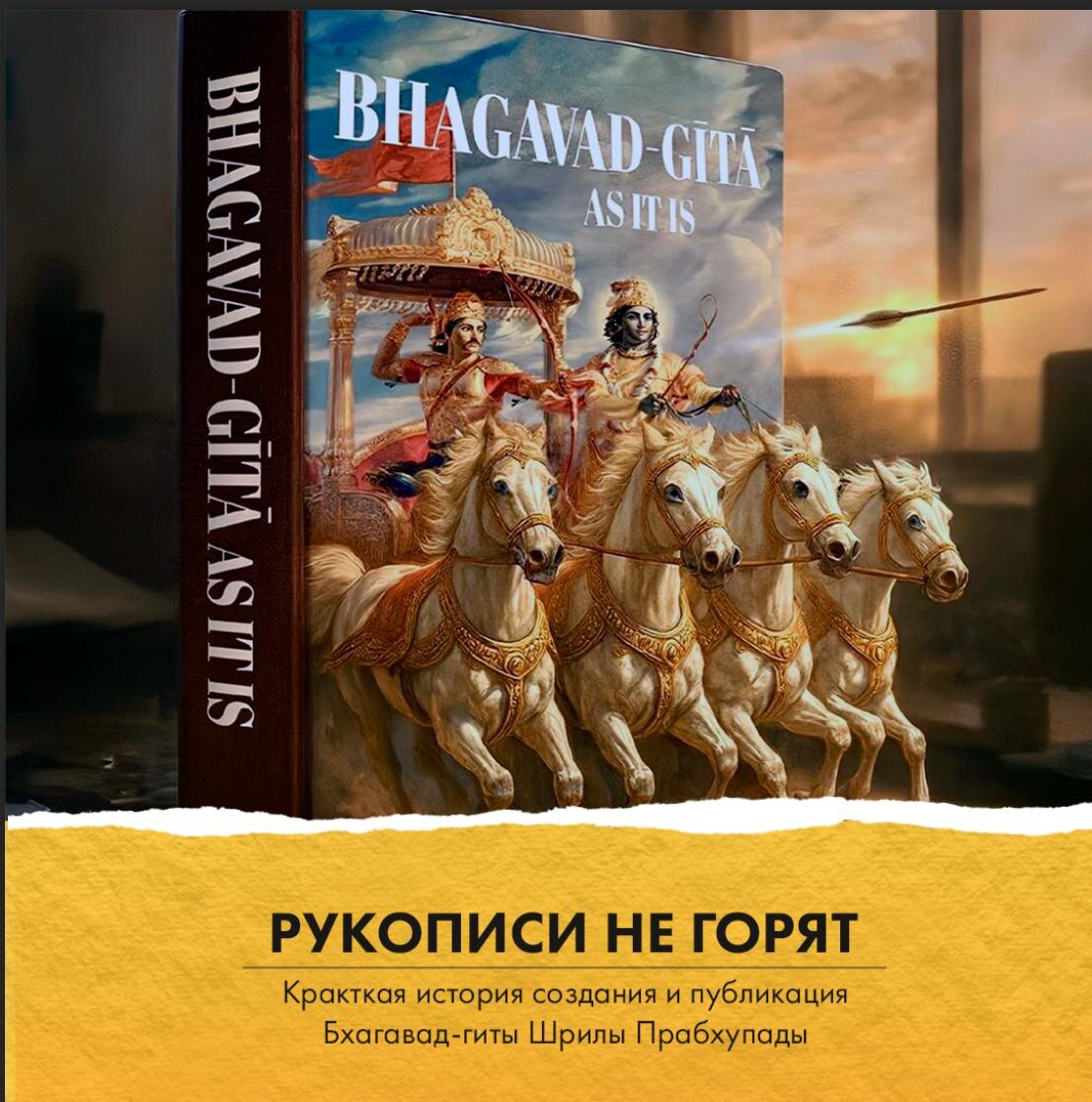 ПЕРВАЯ РУКОПИСЬ История издания «Бхагавад-гиты как она есть» началась ещё во времена семейной жизни Шрилы Прабхупады. После встречи с духовным учителем Шрилой Бхактисиддхантой Сарасвати Госвами молодой Абхай Чаран наряду с публикацией статей своего журнала «Назад к Богу» переводил на английский язык и комментировал стихи «Бхагавад-гиты». Он мечтал издать «Гиту» в трёх томах объёмом 1200 страниц в твёрдом сафьяновом переплёте. Но денег на это не было, бумага в те времена в Индии дефицит, а самое главное — перевод и написание комментариев требовали полной самоотдачи, а приходилось уделять много времени работе для поддержания семьи. Тем не менее Прабхупада несколько лет трудился и почти завершил перевод «Гиты» к апрелю 1948 года. Появился заинтересованный спонсор из Южной Индии — доктор Аллагаппа. Но случилось непоправимое — рукопись украли. Это был единственный экземпляр, который для надёжности Абхай хранил дома. Он спрашивал домочадцев и слуг, но те лишь разводили руками. Колоссальн