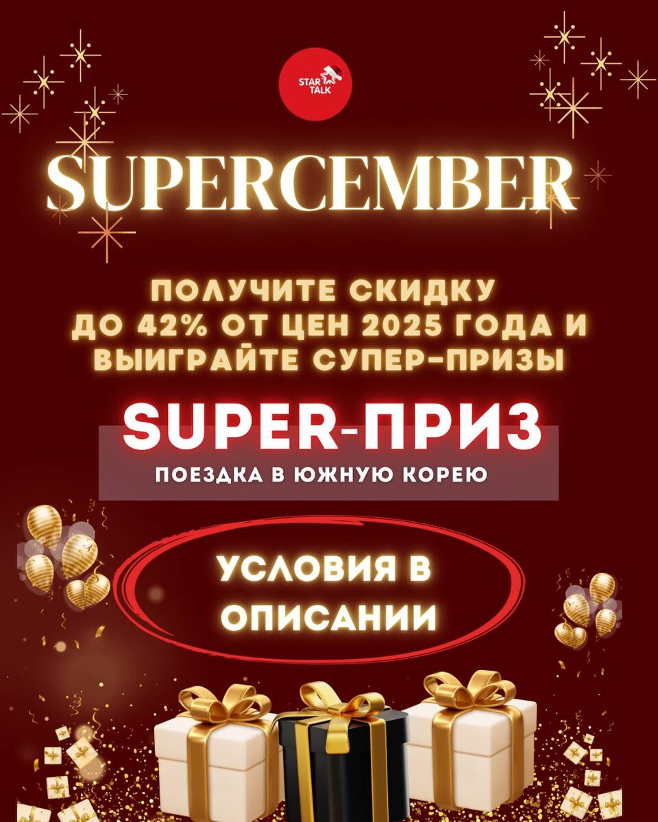 SUPERСЕМВЕR 2025 стартовал! 🎄✨ Школа Star Talk запустила лучшую акцию года, чтобы ваш декабрь был просто СУПЕР: ✨ скидка до 42% от цен 2025 года ✨ розыгрыш супер-призов ✨ главный приз — поездка в Южную Корею весной 2026 года! 🇰🇷 Акция длится до 6 декабря — успейте забрать свои лучшие условия на обучение. 👉 Подробности и запись — на сайте