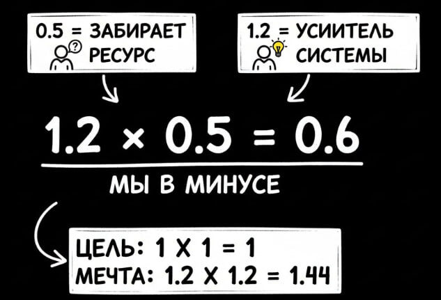 Почему 1,2 × 0,5 = 0,6, и мы в минусе Когда я стал смотреть на делегирование как на математику, многое встало на свои места. Представим, что: 1 - это нейтральный уровень эффективности: задача сделана ровно так, как надо, без потерь и без усиления. 0,5 - это когда человек пока забирает ресурс у системы: его нужно сильно вести, тратить время на объяснения и переделки. 1,2 - это усилитель: человек не только закрывает задачи, но и улучшает систему вокруг. Теперь смотрим на связку: если ты как наставник - 1,2, а сотрудник в этой задаче - 0,5, = то на выходе получается 0,6. Вы пока в минусе по времени и ресурсу: ты вкладываешься больше, чем получаешь. цель - как минимум выйти на связку 1 × 1: когда человек берет задачи своего уровня и делает их стабильно. а мечта - это 1,2 × 1,2 = 1,44: когда и ты, и сотрудник усиливаете систему, а не затыкаете дыры. Меня такой взгляд отрезвляет. Перестаешь ждать от человека 0,5 моментальной прибыли. Начинаешь считать: где ты реально обучаешь, а где