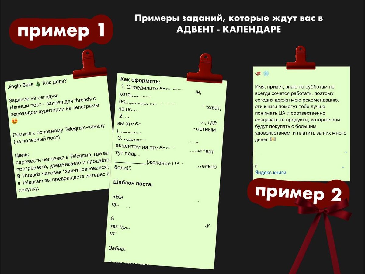 САМОЕ ЩЕДРОЕ ПРЕДЛОЖЕНИЕ ДЕКАБРЯ Адвент - календарь за 990 ₽. Если вы давно хотели оживить блог, вернуть регулярность, набрать новую аудиторию и подготовить площадки к продажам - этот формат для вас. ✔️Подходит тем, кто хочет: • раскачать охваты • вернуть интерес к контенту • привлечь аудиторию перед 2026 • мягко навести порядок на площадках • получить ежедневные смыслы, идеи, конструкции и материалы для ведения блога экспертам, маркетологам, продюсерам, блогерам, фрилансерам. ✔️Кому не подходит: - Тем, у кого нет экспертности - Тем у кого нет желания, делать хоть что-то ради своего результата ✔️Как это работает: - каждый день открываются новые задания и подарки - можно выполнять сразу или в удобном темпе Но есть нюанс: чем позже зайдёте, тем меньше заданий получите, предыдущие числа сгорают Что внутри: • задания для роста охватов • конструкции постов • примеры веток для Threads • идеи для Телеграм • мини-воронки • смыслы декабря • шаблоны кейсов, лид-магнитов и новогодних