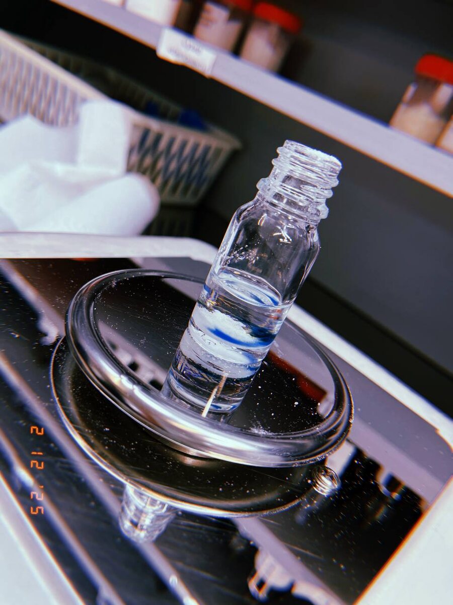 Как человек, влюбленный в парфюмерию, провожу свой день рождения в лаборатории. И вот на весах случается чудо (о котором мне рассказали коллеги). Если смешать ethyl vanilline и rose acetate в дипропиленгликоле, то получается вот такая красота небесного цвета. Я в восторге. Эта магия мне пока неясна…