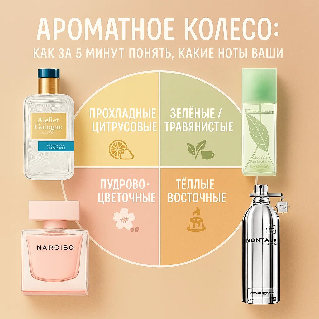 Хватит выбирать «наугад». Берём простую игру: колесо из 4 секторов - это удобная карта вкуса, чтобы быстро отсеять лишнее и попасть в «свою» зону. Сектора: 1) прохладные цитрусовые 🍊⛅· 2) зелёные/травянистые 🌿· 3) пудрово-цветочные 🌸🎀· 4) тёплые восточные 🍮🔥 1) Прохладные цитрусовые 🍋🍊🌊 Звонкая чистота, эффект открытого окна и утро у моря - энергия без сиропа.
