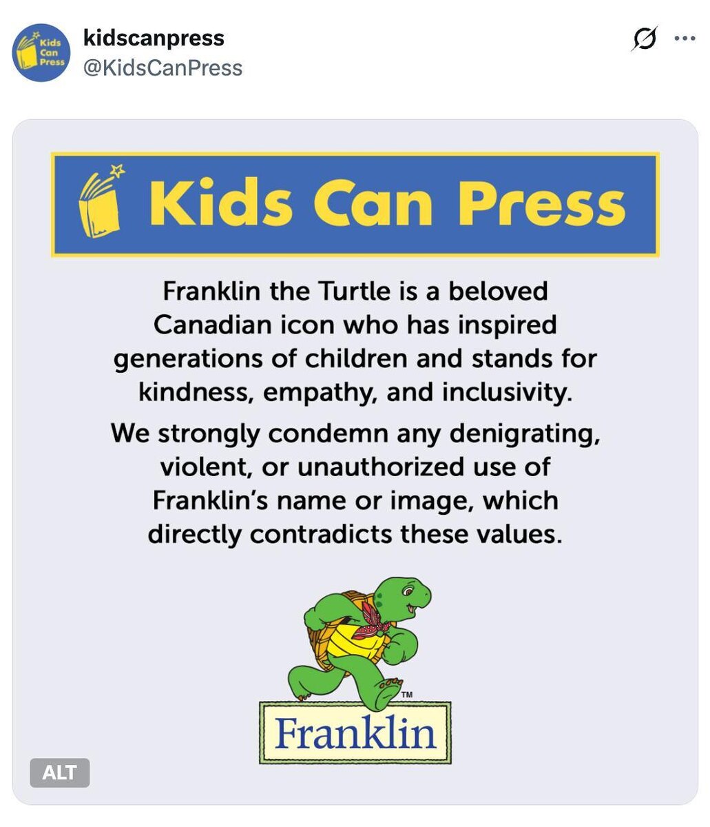 В ответ на пост Publisher of ‘Franklin the Turtle’ children’s books condemns Hegseth’s meme game ‘We strongly condemn any denigrating, violent, or unauthorized use of Franklin’s name or image, which directly contradicts these values’ But what does ‘inclusivity’ have to do with it?