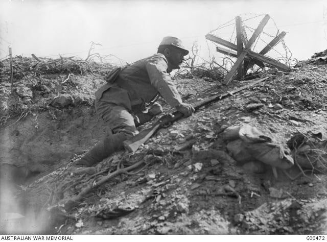 Французский солдат пробирается сквозь проволочные заграждения, чтобы помочь раненому товарищу, Мыс Геллес, 1915 год