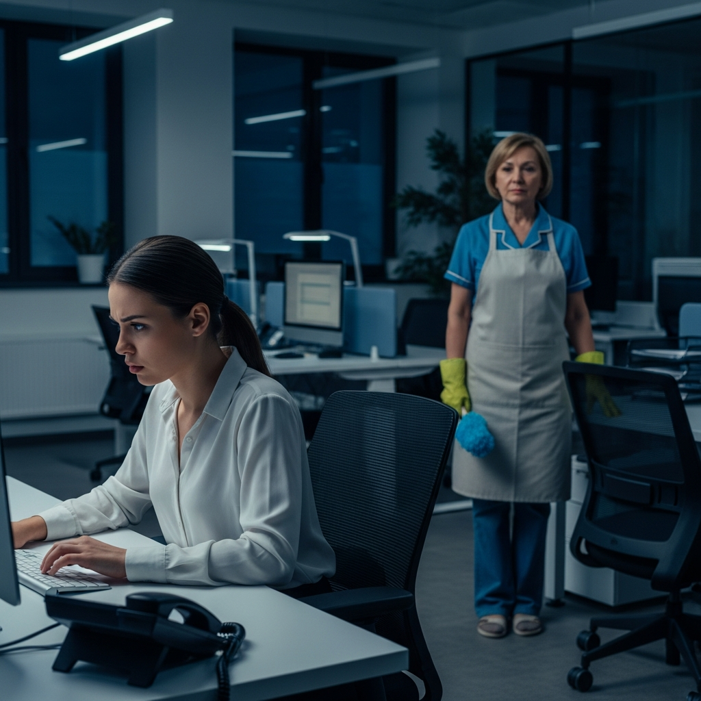 Алина шла по коридору офиса с папкой документов, когда увидела новую уборщицу. Женщина стояла у окна с тряпкой в руках, протирала подоконник. Спина знакомая. Фигура тоже.