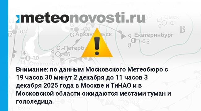 Внимание: по данным Московского Метеобюро c 19 часов 30 минут 2 декабря до 11 часов 3 декабря 2025 года в Москве и ТиНАО и в Московской области ожидаются местами туман и гололедица. Перейти на сайт Прогноз погоды на 14 дней