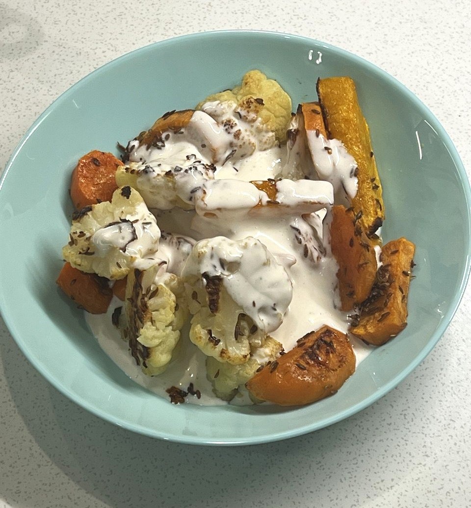 к запечённым овощам — картофелю, батату, моркови, цветной капусте (на фото)