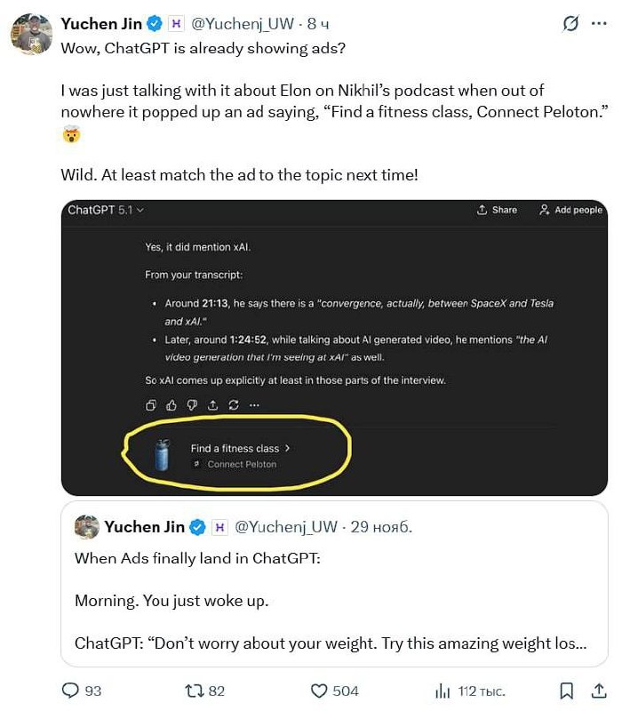 В ChatGPT появилась реклама: пользователь загрузил подкаст и получил ссылку на сервис по выбору фитнес-клуба. Самое удивительное, что даже PRO-подписка за $200 не помогла ему избежать этого. Ранее датамайнеры уже обнаруживали упоминания о рекламе в бета-версии обновления. Постмейкер - автоматическое ведение канала 🤖 Анимация | СhatGPT-4 | Помощь с резюме