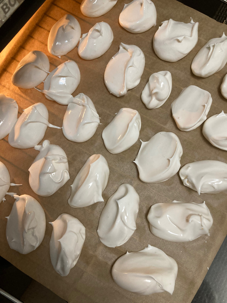 Решила попробовать сделать меренги,никогда не делала. Как говорится первый блин комом. У меня не комом, а все в меренгах. ингридиенты. Яйца 10 щепотка лимонной кислоты. ваилин песок Я кругом искала сколько нужно песка но нигде не было ответа. Пришлось методом проб. Первое я сделала он не совсем густой, ведь его нужно как то отсадить на противень, а у меня чувствую растечется. Что делать , беру другую емкость для сбивания разделяю на три части и добавляю больше песка,но маленькими порциями,получилось уже хорошо.Отсадила в кондитерский мешок и вся стала в меренгах .У меня со всех сторон особенно с верху кондитерского мешка.Дальше думаю что делать? Взяла столовую ложку и стала выкладывать на силиконовую бумагу,все отлично получилось и даже красиво. Третью порцию я прочитала другой рецепт и написано если у вас не получаются миренги, то добавьте крахмал.Где я буду искать крахмал когда я вся по уши в меренгах я придумала быстро добавить сухой кисель и цвет и крахмал есть. Третья