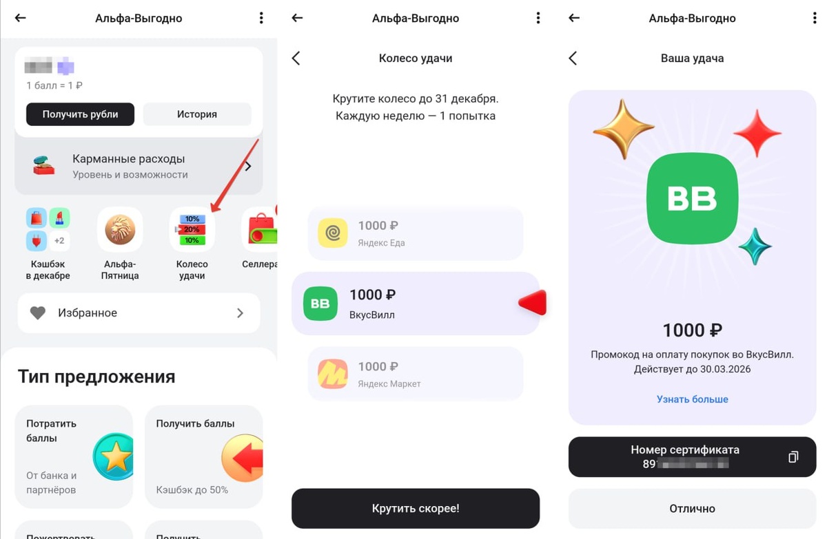 🦆 Барабан от Альфа-Бизнеса: сертификаты от партнеров ⚡ По бизнес-картам от Альфа-банка запустили с сегодняшнего дня «Колесо Удачи». То есть, каждую неделю крутим барабан и получаем плюшки от партнера. 🛒 Мне сегодня выпал сертификат на 1000 рублей во ВкусВилл. То есть достаточно совершить покупку и оплатить им. И это даже не промокод на скидку, а именно сертификат! ➡️ Найти барабан можно в МП Альфа-Бизнеса → Сервисы → Альфа-Выгодно → Колесо Удачи. 🎁 Напомню, за регистрацию ИП/ООО по этой ссылке ИЛИ открытие счета ИП вместе с бизнес-картой по этой ссылке до 14 декабря включительно, банк начисляет сейчас 5000 руб. ❓ А что Вам выпало? Пишите) ✈️ Подписаться | 📊 Все акции