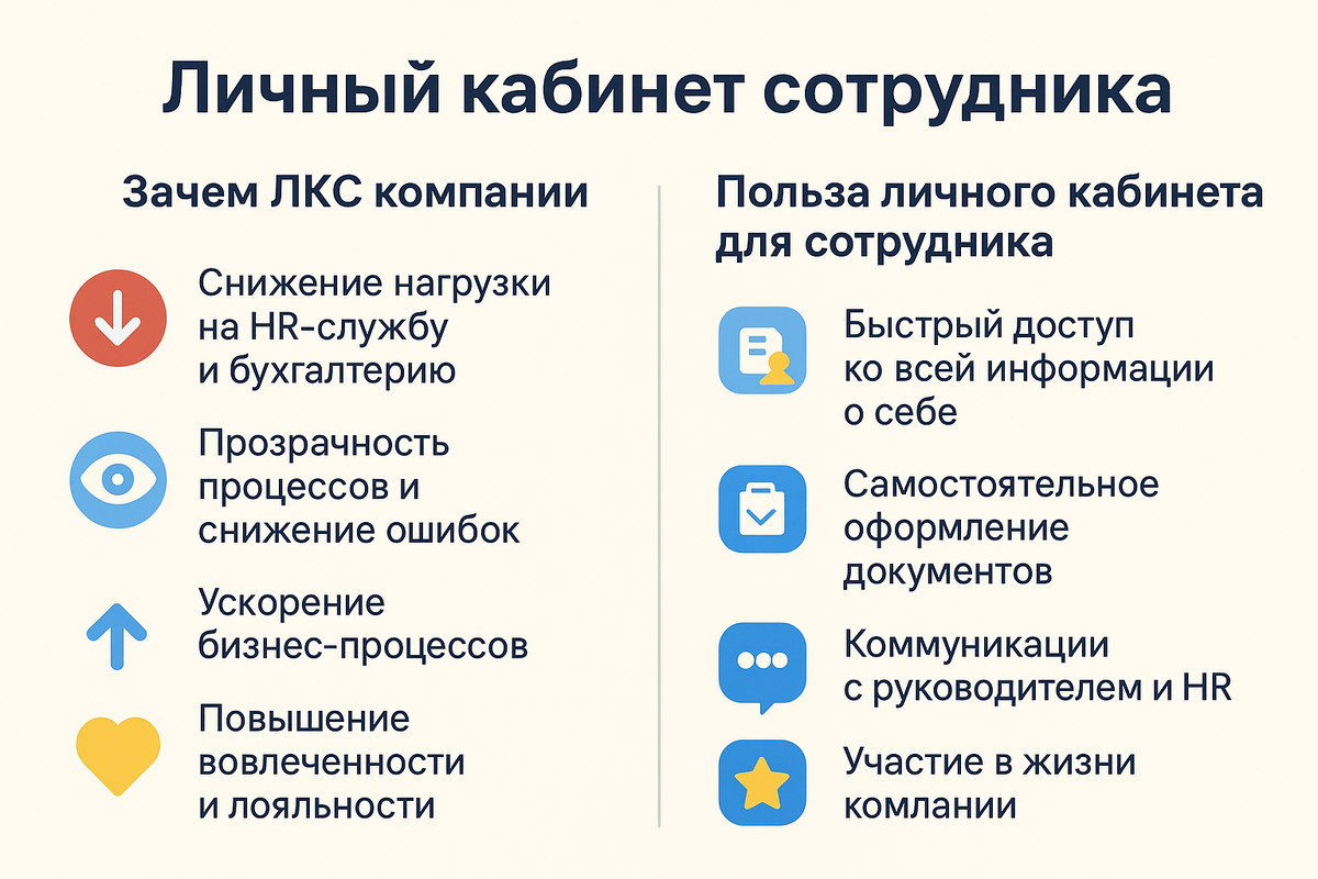Цифровизация рабочего пространства — это уже не тренд, а рабочий стандарт. Многие компании внедряют «Личный кабинет сотрудника» (ЛКС) как часть корпоративной информационной системы: будь то 1С ЗУП КОРП, HRM-платформы или внутренние порталы. Но что на самом деле дает такой инструмент бизнесу и сотрудникам? Рассмотрим подробно. Зачем ЛКС компании 1. Снижение нагрузки на HR-службу и бухгалтерию Без личного кабинета HR и кадровики буквально «зашиваются» в вопросах: «Сколько у меня дней отпуска?» «Где получить справку?» «Когда будет премия?» «Можно ли переслать расчетный листок?» Каждый такой вопрос отнимает рабочее время. ЛКС закрывает до 40–60% рутинных запросов, переводя общение в самообслуживание. Сотрудник сам может скачать документы, посмотреть календарь отпусков, подать заявления. А специалисты занимаются не ответами «копипаст», а реальными задачами: адаптацией, развитием сотрудников, аналитикой. 2. Прозрачность процессов и снижение ошибок Когда информация разбросана по почтам, чата