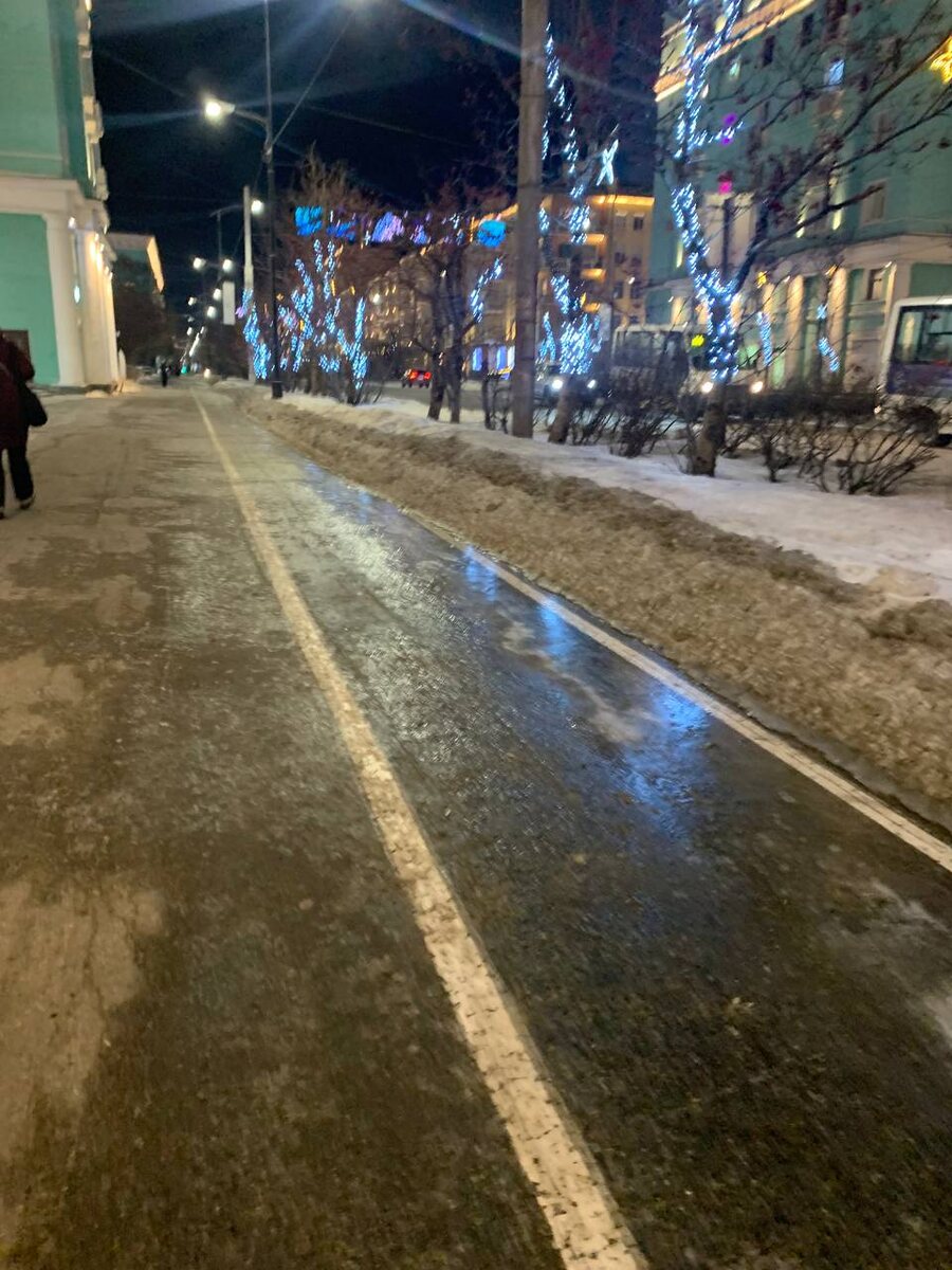В ответ на пост Мурманские велодорожки – образец универсальности. Летом на них можно кататься на велосипедах и самокатах, а зимой, в зависимости от объема высыпанной соли и температуры воздуха, с переменным успехом можно устраивать либо заплыв (по талой воде), либо соревнования по конькобежному спорту. #ГородскиеВторники на ❄ «Арктическом Обозревателе» // Фото – #ОтЧитателей