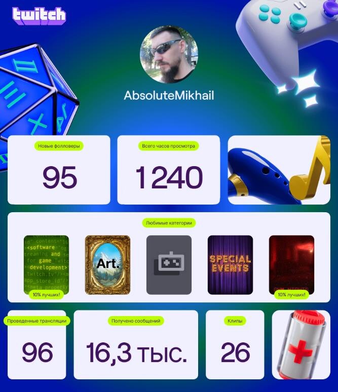 На twitch вышли итоги года. Как стример в категории разработка я попадаю в топ 10% лучших. 👹 На самом деле доволен как слон. Это же круто? 🤔 Играю в демки иногда, но в основном стримы посвящены разработке игр на Unreal Engine, изредка С++. Кому интересно подобное, буду рад новым фолловерам twitch.tv/absolutemikhail p.s. Посмотреть ваши итоги года twitch