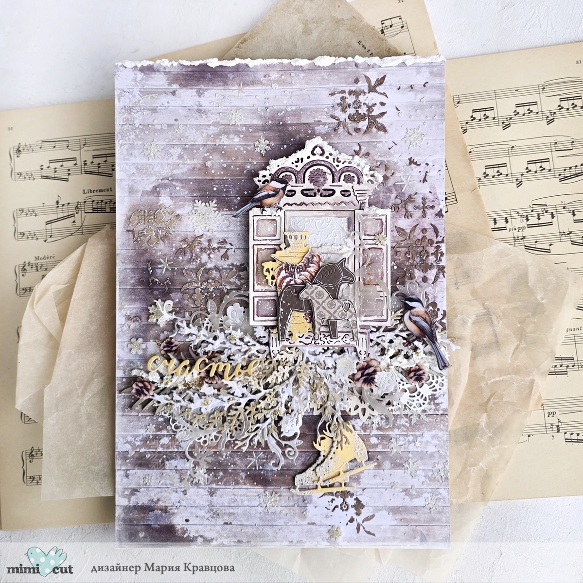 С вами Мария Кравцова и мое зимнее вдохновение для вас. Календарная зима уже наступила, но за окном плюсовая температура и выпавший снег давно растаял. А так уже хочется пушистого снега и морозного воздуха, прогулок по хрустящему снегу и теплого ароматного чая после нее. Поэтому родилось мое снежное панно про зимнее счастье и вкусный чай из самовара. Началась моя идея с окошка из набора "Расцвела под окошком" и листа бумаги с деревянным принтом. К нему быстренько прискакали чудесные лошадки из набора "Хюгге" и для уюта запросился самовар из набора "Выпьем чаю, кофею". Завитки из набора "А я росла в узорной тишине" прекрасно справились с ролью морозных узоров. Вырубила их из перламутровой кальки. Веточки из набора "Липа и туя" покрыла текстурной пастой и присыпала флоком для создания снежного эффекта. Также в создании панно мне помогали ножи из наборов "Снеговик" (звездочки, вырубила их их перламутровой кальки), "Это оно" (заголовок), "Связано крючком", "Примерзло солны