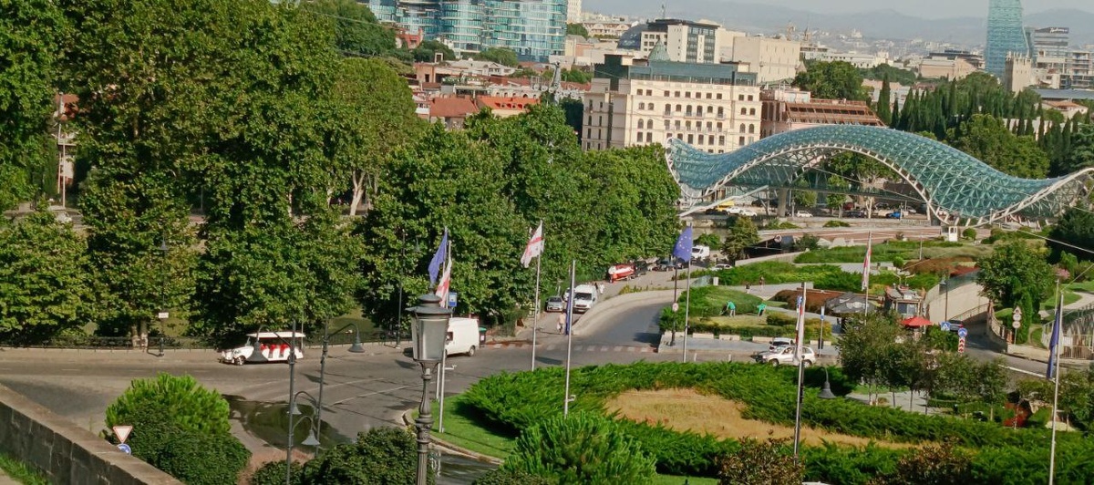 В опоздании есть свои плюсы — ты никого не ждёшь. Итак, мы и все собравшиеся в вестибюле отеля дружно выходим на улицу и садимся в микроавтобус. Наши свободные места почти в самом конце, за нами только ряд из четырёх кресел, они, кстати, без кондиционера. Едем, я переживаю, что у нас нет с собой воды, зато я привезла термос в ручной клади! И где он? В отеле, где же ещё! А ведь любому нормальному человеку, особенно в жару и на длительной экскурсии, нужна вода. Остановка возле другого отеля: в автобус заходит оставшаяся часть нашей группы, и Виктория раздаёт каждому туристу пол-литровую бутылку с водой. Это очень приятно — ненавязчивая забота о нашем здоровье и хорошем самочувствии. Путешествие начинается. Мы направляемся из Тбилиси по проспекту Руставели. Проезжаем мимо красивого стеклянного здания, высотой около ста тридцати метров — это небоскрёб Biltmore Hotel Tbilisi. Фотографировать не успеваю. Затем я замечаю впереди очень необычное здание. Виктория сообщает, что это головно