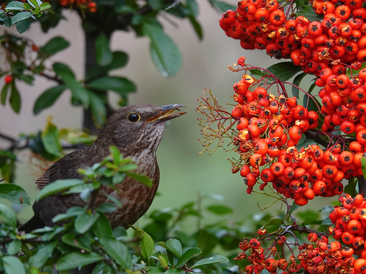 Декоративный кустарник пираканта привлекает осенью пернатых.