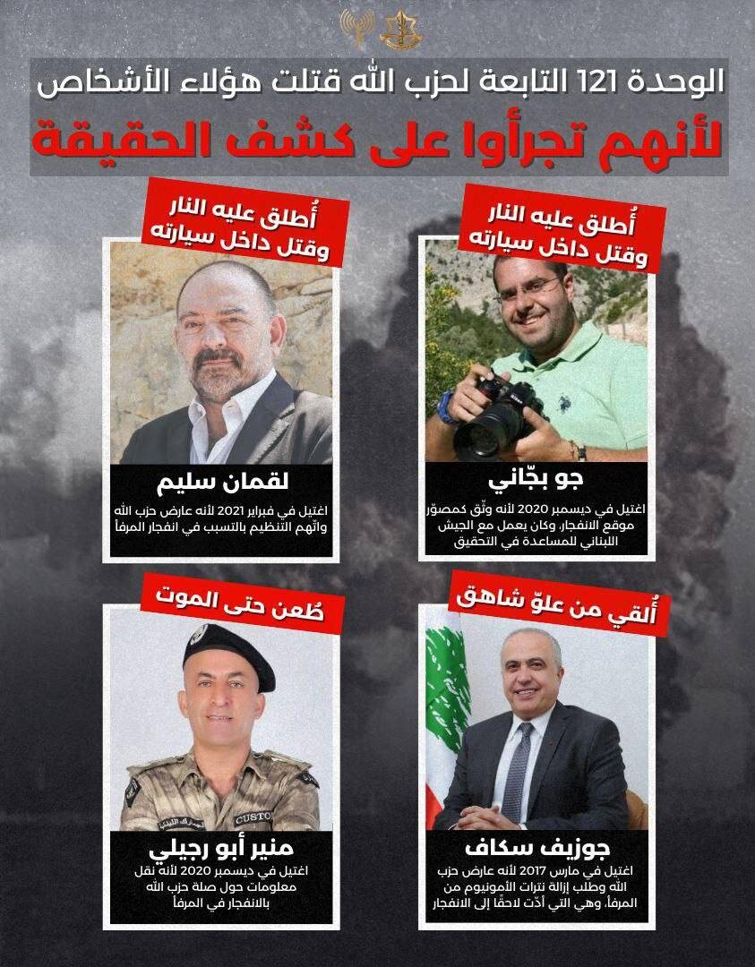 Армия обороны Израиля сообщает: подразделение 121 "Хизбаллы" ликвидировало четырёх ливанских общественных деятелей, опасаясь, что те