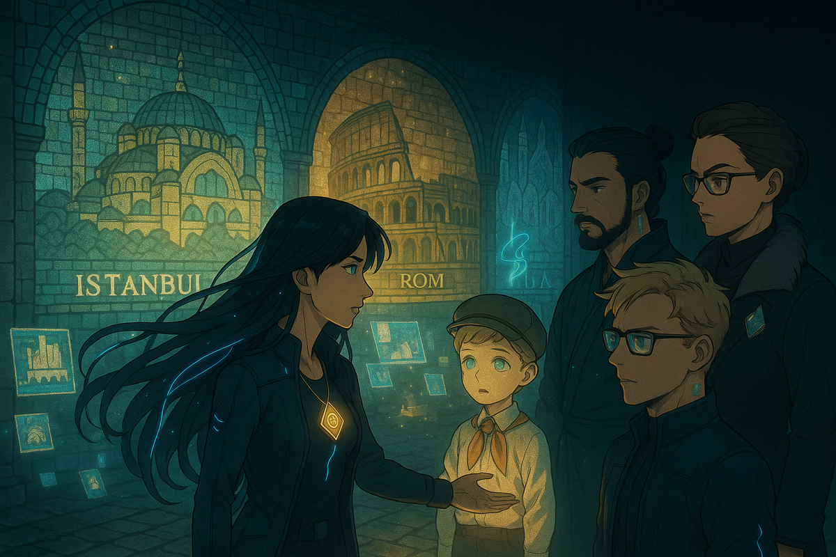 Пыль падала с потолка ровным дождем. Шаги преследователей эхом отдавались по артерии. «Какой час?» — спросила Анна, не отводя взгляда от протянутой руки Серёжи. Мальчик улыбнулся знанием, которого не должно быть в детских глазах. «Тот, который ты готова отпустить. Не самый болезненный и не самый радостный. Просто час из середины. Из той жизни, что была до того, как всё изменилось». Игорь схватил её за плечо. «Это ловушка. Мы не знаем, что он забирает. Память — это не файл. Это ткань личности». «Но если мы не успеем...» — Анна не договорила. Карта Звеньев в её памяти показывала две точки: яркую пульсацию в Стамбуле и тревожное мерцание в Риме. Лео подошёл к стене, где минуту назад оживала мозаика. «Есть другой путь. Я могу создать временный мост. Но мне нужен якорь с той стороны». Надежда сделала шаг вперёд. «Я знаю человека в Риме. Коллекционера. Собирает артефакты, которые другие считают мусором истории. Если твоя сестра работает с древними объектами, он её знает». «Свяж