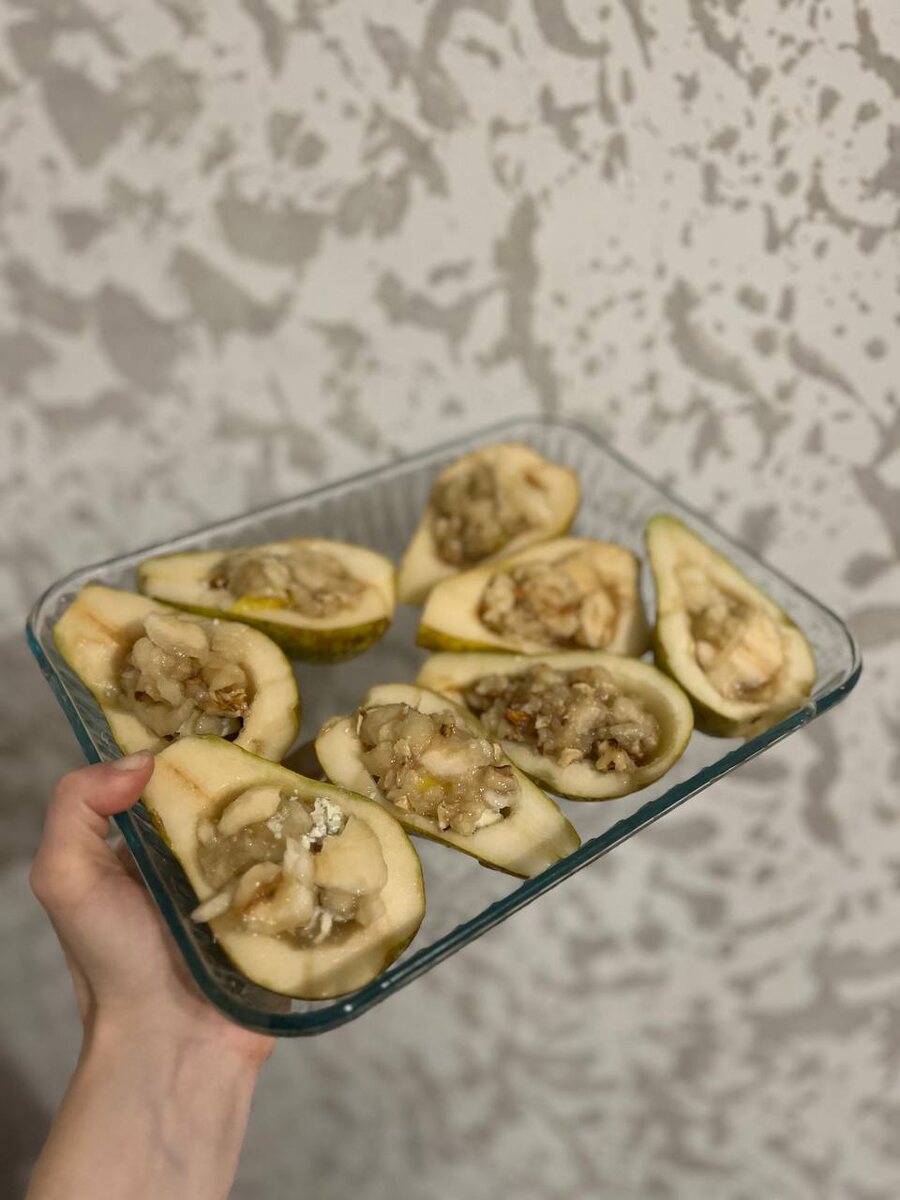 Запеченная груша с сыром и мёдом 😋 Нужно: 🍐 груша 🍯 мед 🧀 сыр с плесенью 🌰 орехи (грецкие лучше всего) Супер просто и очень вкусно: 🔶 готовим грушу: Моем, режем по полам, вырезаем сердцевину с косточкой и еще чуть больше места для сыра и мёда 🔶 косточки я выкидываю, а части груши мелко разминаю вилкой и добавлю сыр и мед 🔶 мелко крошу орехи и добавляю в смесь 🔶 полученную смесь добавляю в сердцевину груши И ставлю запекать в духовку при 180 градусов на 15-25 минут (15 минут для получения румянца, но с сохранением упругости, 25 минут для тех, кто любит более мягкие груши) Приятного аппетита! 😋 #кухня #рецепт
