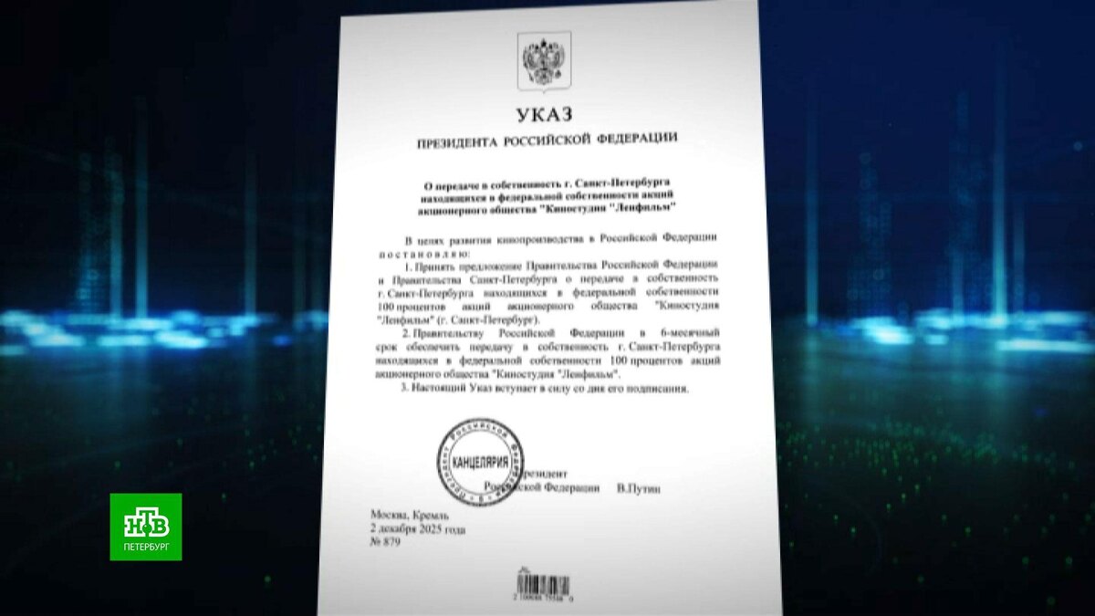[ Смотреть видео на сайте НТВ ] «Ленфильм» сменил собственника. Сегодня Владимир Путин подписал указ о передаче киностудии из федеральной собственности в собственность Петербурга. Документ уже опубликован на официальном портале правовой информации. Согласно документу, такое решение было принято в целях развития кинопроизводства. Он же предписывает правительству России обеспечить передачу 100% акций «Ленфильма» городу в течение шести месяцев. По предварительным планам, работа киностудии будет сосредоточена на патриотическом и историческом кино. [ Смотреть видео на сайте НТВ ]
