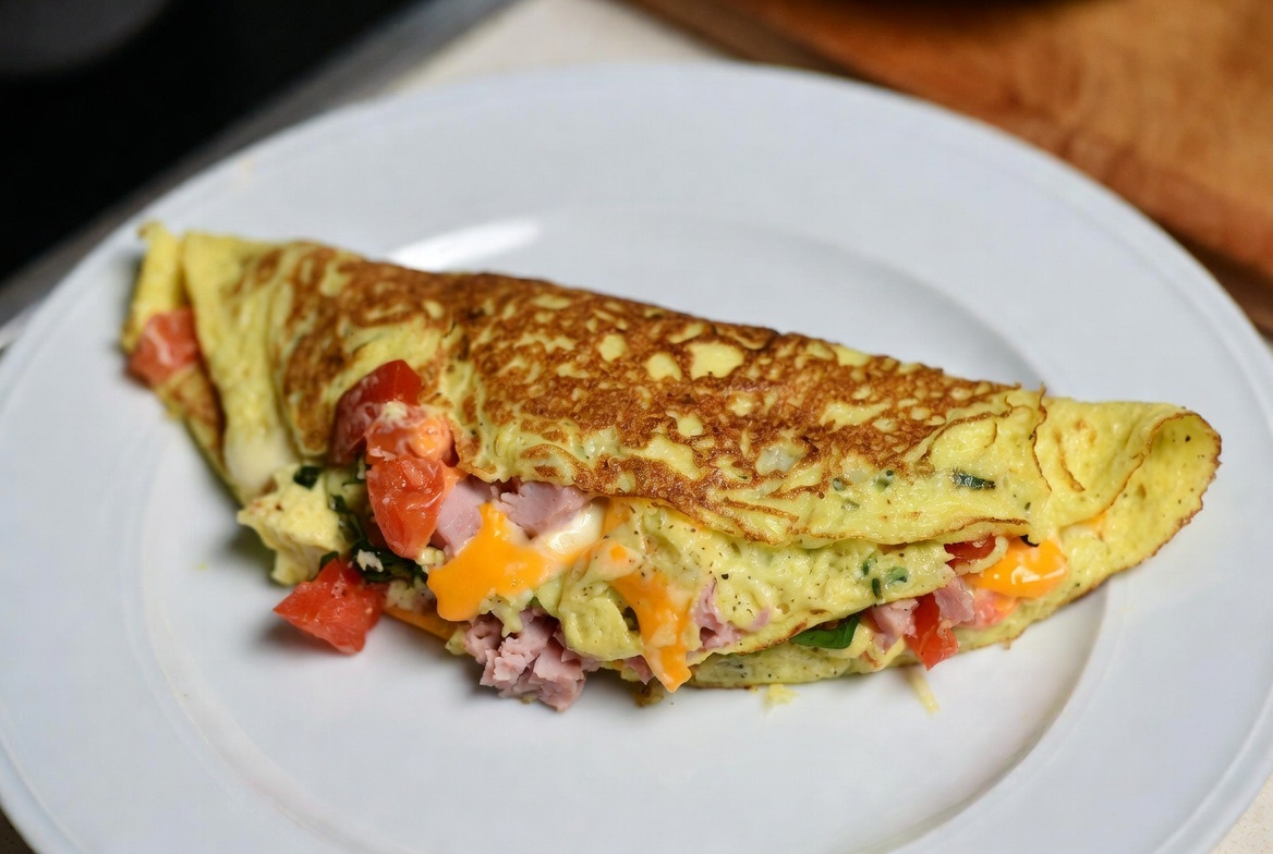 Рецепт пышного омлета с сыром, помидорами и ветчиной Ах, как же приятно начинать день с вкусного и сытного завтрака! Или заканчивать его лёгким, но таким душевным ужином. Этот омлет — моя палочка-выручалочка, когда хочется и себя побаловать, и домашних порадовать чем-то простым, но очень-очень вкусным. Секрет пышности — в обычном молоке и правильном приготовлении. Попробуйте, и ваши близкие скажут вам спасибо! Ингредиенты (на 2 порции, в меру сытных): Яйца — 4 штуки (свежие, отборные, лучше домашние) Молоко — 4-5 столовых ложек (можно немного сметаны для нежности) Помидор — 1 средний, крепкий (чтобы не дал много сока) Ветчина или хорошая варёная колбаса — 100-150 грамм (берите ту, что любите) Сыр твёрдый (российский, гауда, чеддер) — 70-80 грамм Мука — 1 столовая ложка без горки (вот наш секрет пышности!) Соль, молотый чёрный перец — по вкусу Сливочное масло — небольшой кусочек для сковородки Зелень (укроп, петрушка) — для подачи, по желанию Приготовление (с любовью и без суеты): Под