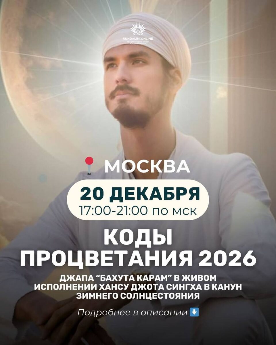 Магическое исцеление невезения и нужды. Открой источник реального Процветания! ☀️20 декабря состоится мощнейшее событие: Джапа «Бахота Карам» в живом исполнении Хансуджот Сингха в Москве!📍 Мы соединили три магических элемента, чтобы ты получила алхимию процветания в 2026 году: ✨абсолютно магический и расширяющий сознание голос Хансуджот Сингха ✨Джапу 25 стиха Джапджи- Бахота Карам ✨Зимнее Солнцестояние Это поистине уникальное событие, когда появляется возможность побыть в живом поле Мастера йоги звука такого масштаба! Сколько раз ты чувствовала, что всё упирается в потолок? •Когда ты вкладываешь усилия, а поток не идёт. •Когда внутреннее состояние не совпадает с тем, чего ты действительно хочешь. •Когда ощущение изобилия кажется чем-то далёким — как будто оно для других, но не для тебя. Даже если в вашей ауре записана бедность, этот стих даст вам процветание и привлечет необходимые для этого возможности. Процветание — это не усилие, это состояние! Поверь в это! ☀️Коды пр
