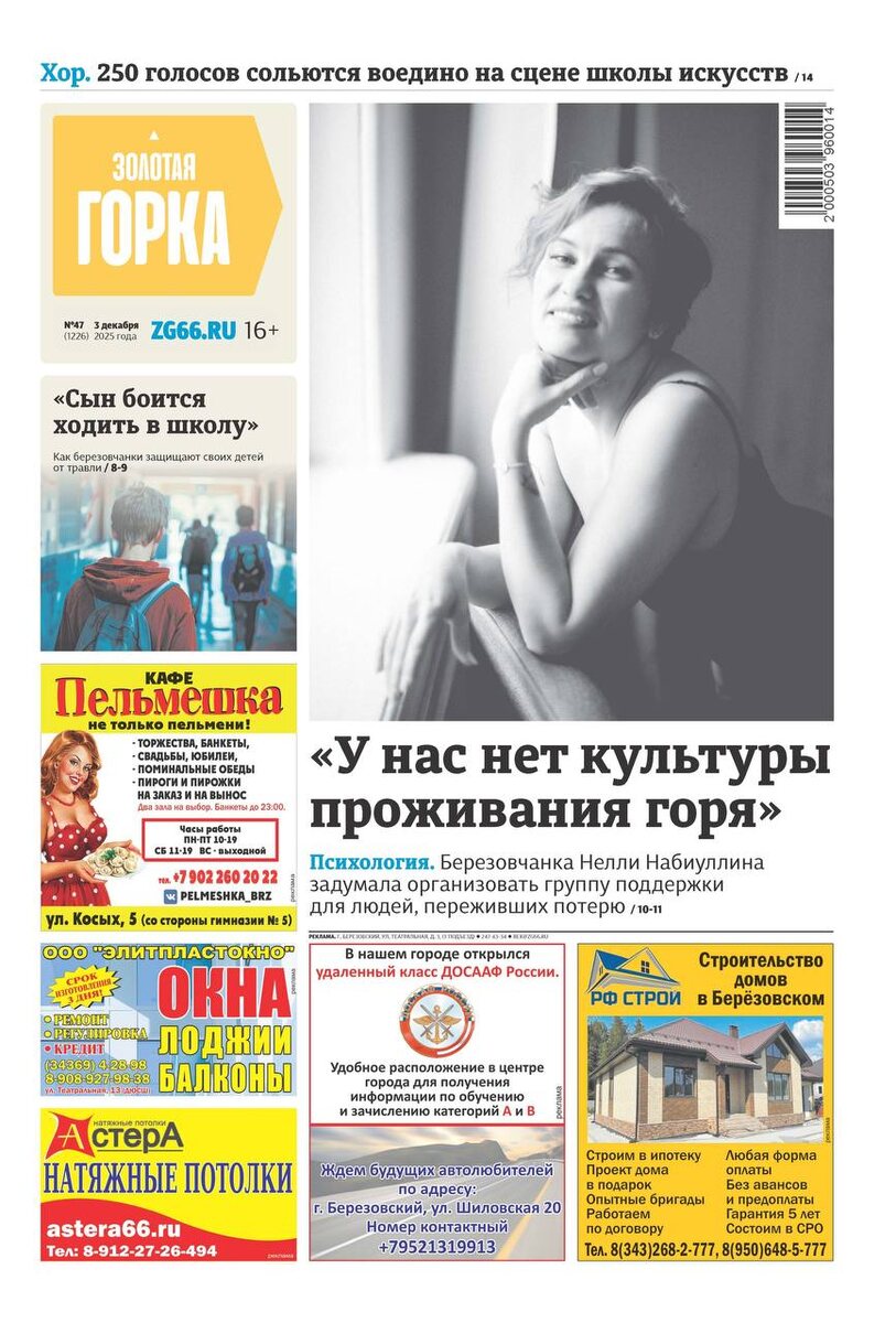 Березовчанка Нелли Набиуллина задумала организовать группу поддержки для людей, переживших потерю. Компетенции у нее есть: Нелли написала магистерскую диссертацию на тему «Особенности эмоциональной поддержки и психологической адаптации вдов в онлайн-группах социальных сетей». Программа создана и апробирована. В свежем номере рассказываем о задумке нашей землячке, которая сама несколько лет назад пережила потерю супруга. Со школьной травлей сталкивается огромное количество детей, и иногда она приводит к по-настоящему трагическим последствиям. К нам в редакцию обратились две мамы, которые столкнулись с этой проблемой, и рассказали о своем опыте. Кроме этого в свежей «Золотой горке»: • «Парки Берёзовского» рассказывают о подготовке к Новому году. • Приводим основные моменты прошедшей прямой линии губернатора. • И рассказываем, что 7 декабря Берёзовский станет пристанищем для хоров области – в Детской школе искусств № 1 пройдет фестиваль «Золотые голоса». В этот день 250 голосов сольютс
