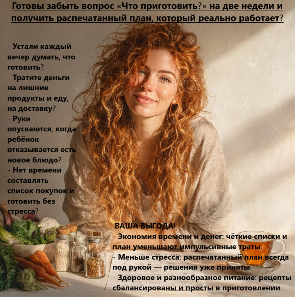 Готовы забыть вопрос «Что приготовить?» на две недели и получить распечатанный план, который реально работает? 🍽✍️ Больше не тратить вечера на придумки, не покупать лишнего и не переживать из‑за перекусов — получите удобный 14‑дневный план питания (печать) за 4–6 рабочих дней. Что входит: - Полный 14‑дневный план с ежедневными приёмами пищи (завтрак, перекус, обед, полдник, ужин). - Полные рецепты: пошагово, с указанием времени приготовления и порций. - 2 варианта замены на неделю (вегетарианский / без глютена / низкоуглеводный — по выбору). - Два списка покупок: по неделям и по категориям (для быстрой покупки в магазине). - Файлы в формате для печати (A4/PDF) — удобно распечатать и повесить на холодильник. Срок выполнения: 4–6 рабочих дней. ⏳ Есть три варианта в зависимости от уровня персонализации и бюджета. Пакет «Старт» — экономный вариант ✔️Что входит: базовый 14‑дневный план, рецепты, 2 списка покупок, 2 варианта замен на неделю. ✔️ Формат: напечатанный комплект PDF + электрон