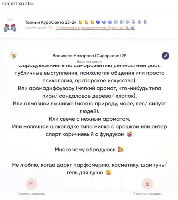 В ответ на пост Поясню правила и алгоритм для тех, кто не очень понимает, что это за игра и как всё будет происходить. Суть: сделать приятное тому, кому ты выпадешь Тайным Сантой (что-то вроде анонимного Деда Мороза или Снегурочки 😁). Сумму определяем в голосовалке выше, но всё на ваше усмотрение (если вы готовы потратиться больше — пожалуйста, ваше право!). 1. Желающие поиграть отмечаются в голосовалке. Дальше обозначим крайние сроки проведения игры. 2. Далее соберу ваши имена, чтобы понимать количество и участников. 3. В спец. бесплатном боте собираю желающих, как организатор запускаю жеребьёвку. 4. Участники заполняют в этом боте свою карточку: там можно писать, что угодно. Например, конкретные ссылки на ваши хотелки в вб/озон/яндекс или обозначить сферу интересов, или же написать, чего точно вам не стоит дарить (на фото пример моих старых карточек). Карточку можно редактировать. Там же вы указываете, как вам лучше доставить подарок: чтобы человек заморочился и послал почтой Росс
