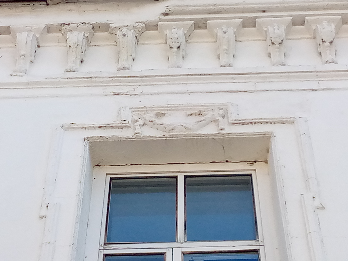 Двухэтажное Г-образное в плане здание протяженным симметричным западным фасадом в одиннадцать световых осей, прорезанное по центральной оси проездной аркой, выступает на красную линию улицы Мира (ранее Торговую). Углы объема и центральная ось проезда на главном фасаде выделены крупными, на высоту двух этажей, лопатками, которые рустованы на уровень первого этажа и оформлены каннелированными филенками на втором, и менее массивными лопатками на уровне второго этажа. Угловые лопатки завершаются парапетными тумбами, лопатки центральной оси – разорванным лучковым фронтоном со значительно возвышающимся полуциркульным аттиком, в тимпан которого вписан картуш барочного рисунка. Рустованную поверхность фасада первого этажа прорезают прямоугольные дверные и оконные проемы. Оконные проемы акцентированы большими замковыми камнями. Оконные проемы северной и южной частей фасада прямоугольные и оформлены штукатурным фигурным рамочным наличником с гирляндой над окном. Окно центральной части