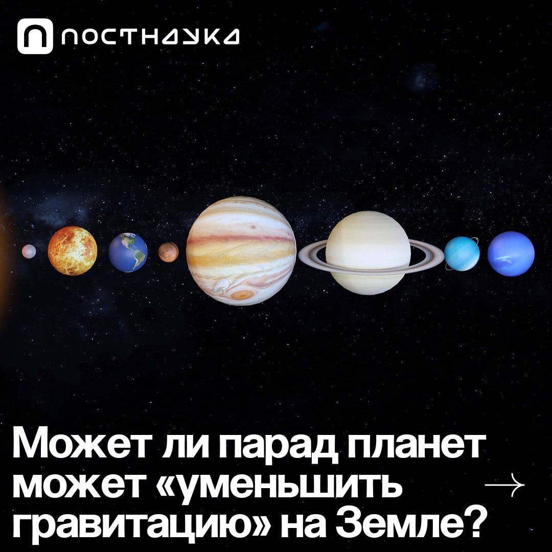 Парадами планет называют моменты, когда все планеты выстраиваются в цепочку по направлению к Солнцу и их гравитационные силы складываются арифметически. Разумеется, на одной прямой все планеты никогда не соберутся, но если ограничиться требованием, чтобы все восемь планет собрались в гелиоцентрическом секторе с углом раствора не более 90°, то такие «большие» парады иногда происходят — в среднем один раз за 120 лет. Может ли совместное влияние планет изменить гравитацию на Земле? Объясняет астроном, кандидат физико-математических наук Владимир Сурдин.