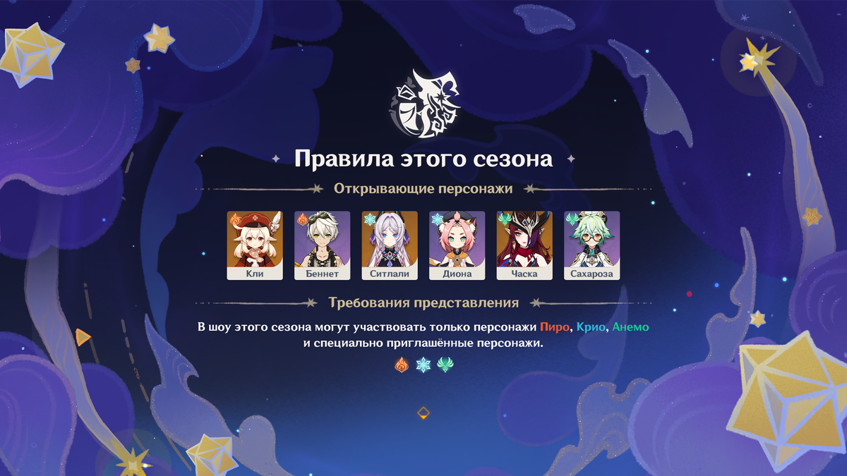 Сезон продлится до 31 декабря. Играть можно только персонажами трех стихий: Пиро, Крио и Анемо, плюс специальные гости.